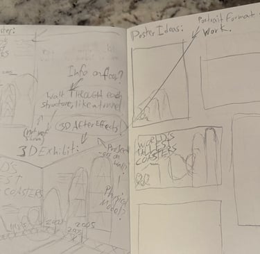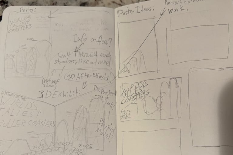 To the right are some very early initial sketches I made after being assigned the project. The 3D exhibit was originally meant to be much larger and not just one screen on a wall, but timing resulted in me downscaling the piece.