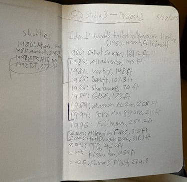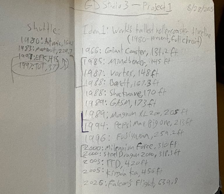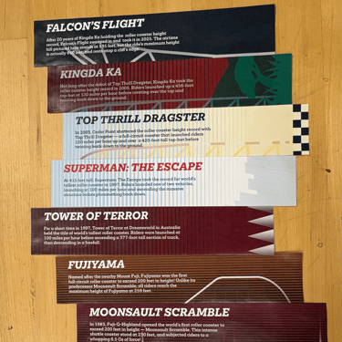 This project is a timeline of the "World's Tallest Roller Coaster" record holders since 1983, formatted for 3 different deliverables — A 2'x10' banner, a set of 2"x10" bookmarks, and a motion graphic meant to be played on a large screen in a walk-through exhibit.