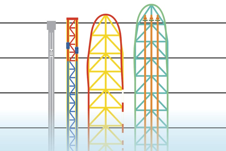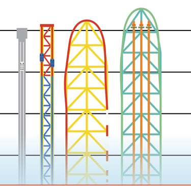 The image on the left shows the beginning of my process in Adobe Illustrator. After creating vector art for each ride, I added lines in the background to represent 100 feet each. I then adjusted the height of each ride accordingly.