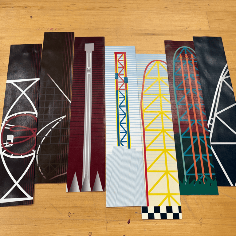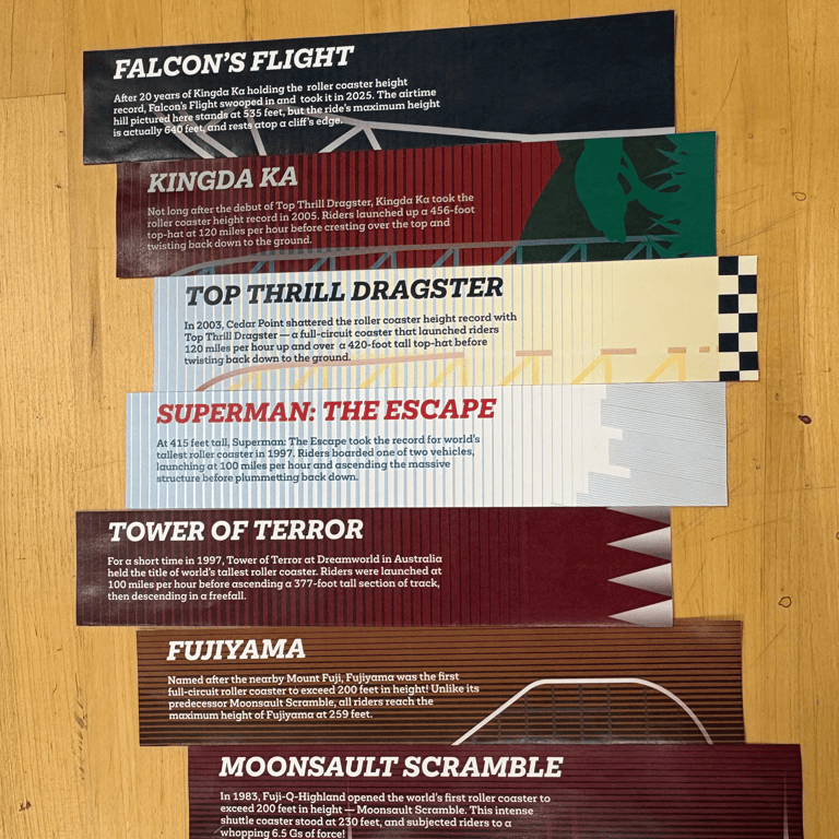 A timeline showing the history of the world's tallest roller coaster record breakers since 1983. Shown here are a series of double-sided bookmarks, but a 2x10 foot banner and motion graphic exhibit were also created. Both of these can be viewed with the button below.