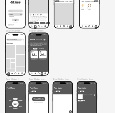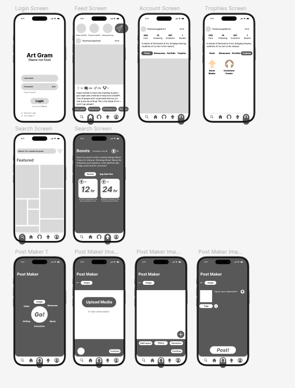 I then started working on some lo-fi wireframes for the most significant screens, based on what I established in my ideation document. Many different icons were created, and each of these would need to be remade in Adobe Illustrator before being placed in the Figma file for the final screens. The app also did not have a name at this point in the process.