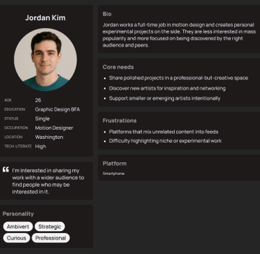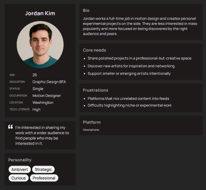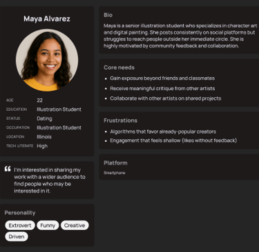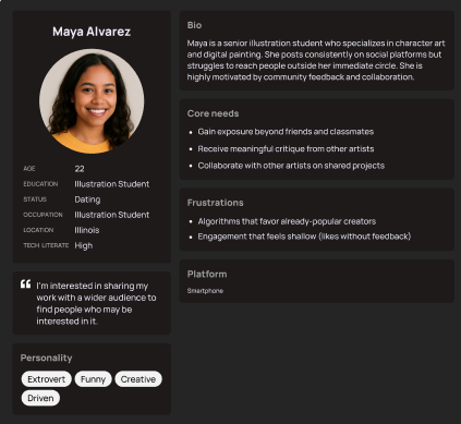 Some user personas were also created to give a better idea of the types of people using Creatorise, including their goals, needs, likes, and dislikes.